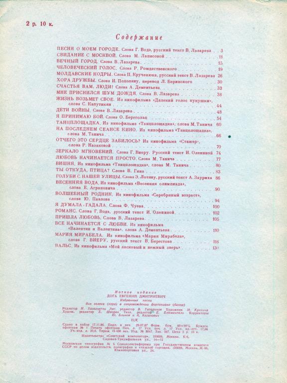 Евгений Дога избранные песни. Для голоса (хора) в сопровождении фортепиано (баяна) 1987г.