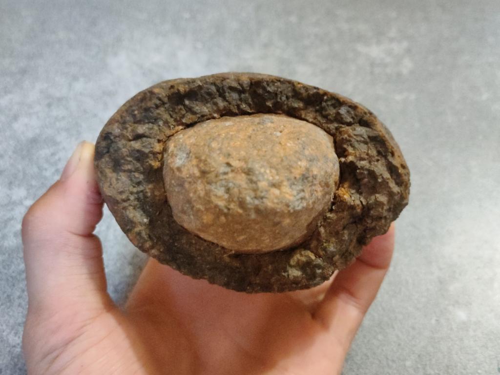 Камень с наружной стороны серый, мягкий и рассыпчатый, если сильно надавить ногтем, изнутри слегка оражневый, твёрдый.