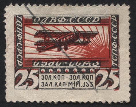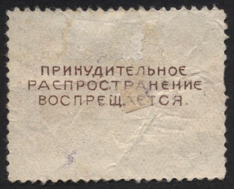 Непочтовая марка "Общество друзей воздушного флота СССР" 25 зол. коп. На обороте надпись "Принудительное распространение воспрещается"