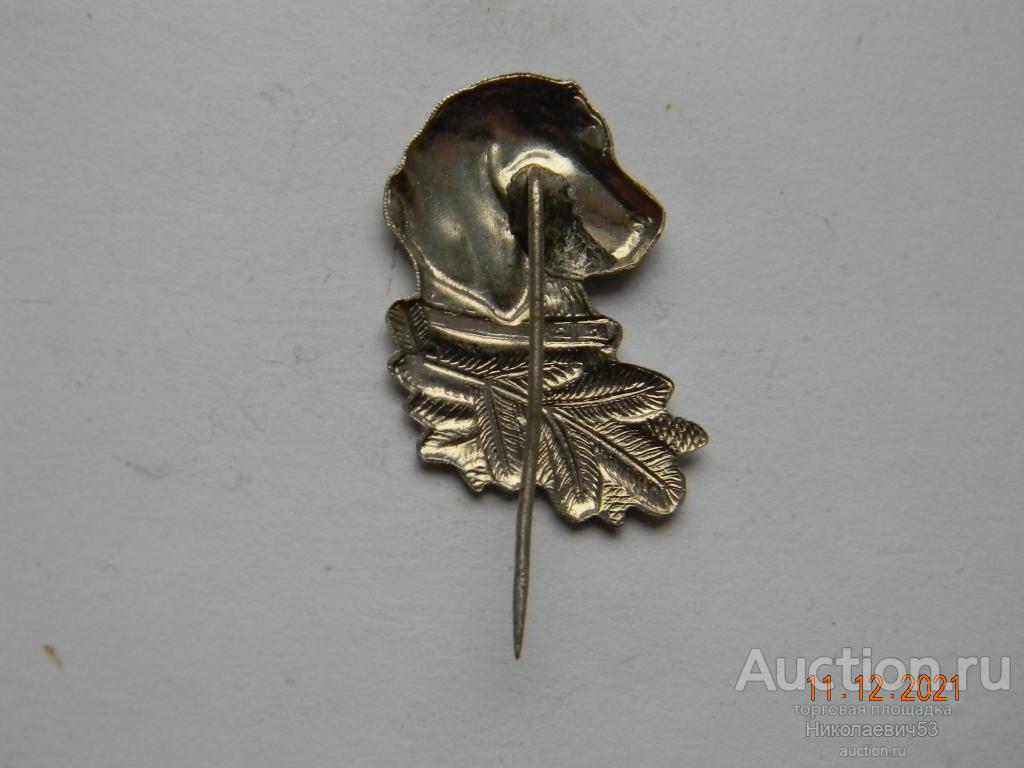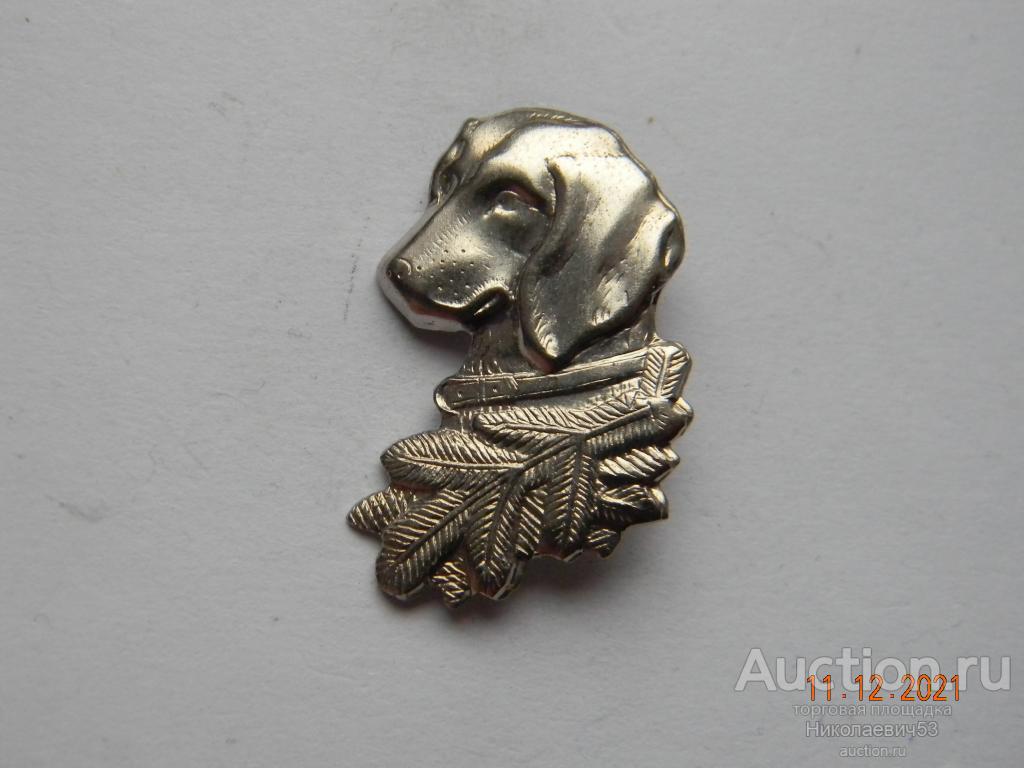 Значок Охота. Охотничья собака. Значок-кокарда на головной убор охотника, тяжелый металл, булавка, клеймо отсутствует. Состояние на скане.