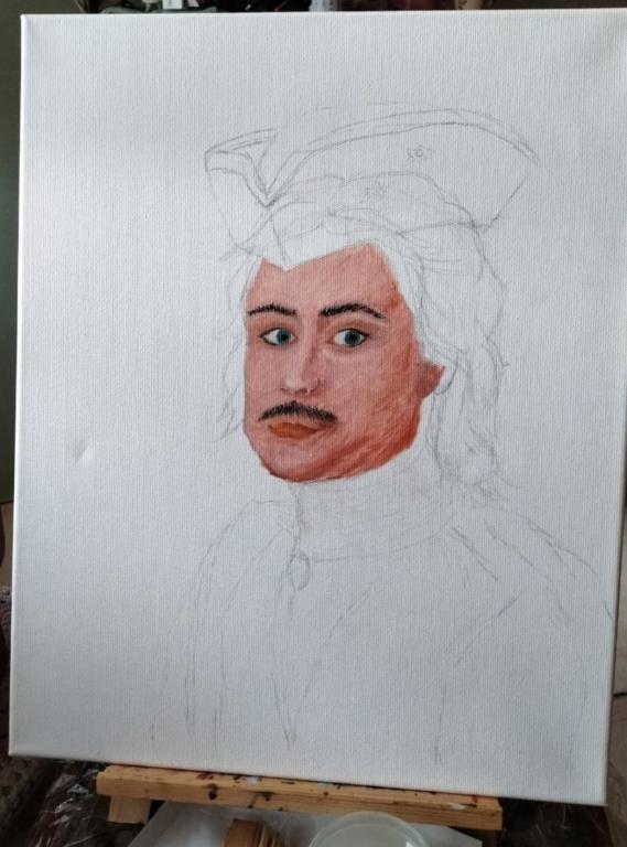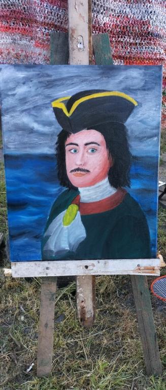 Фон, на котором изображен портрет Петра I, олицетворяет его удачные и неудачные попытки завоевать море.