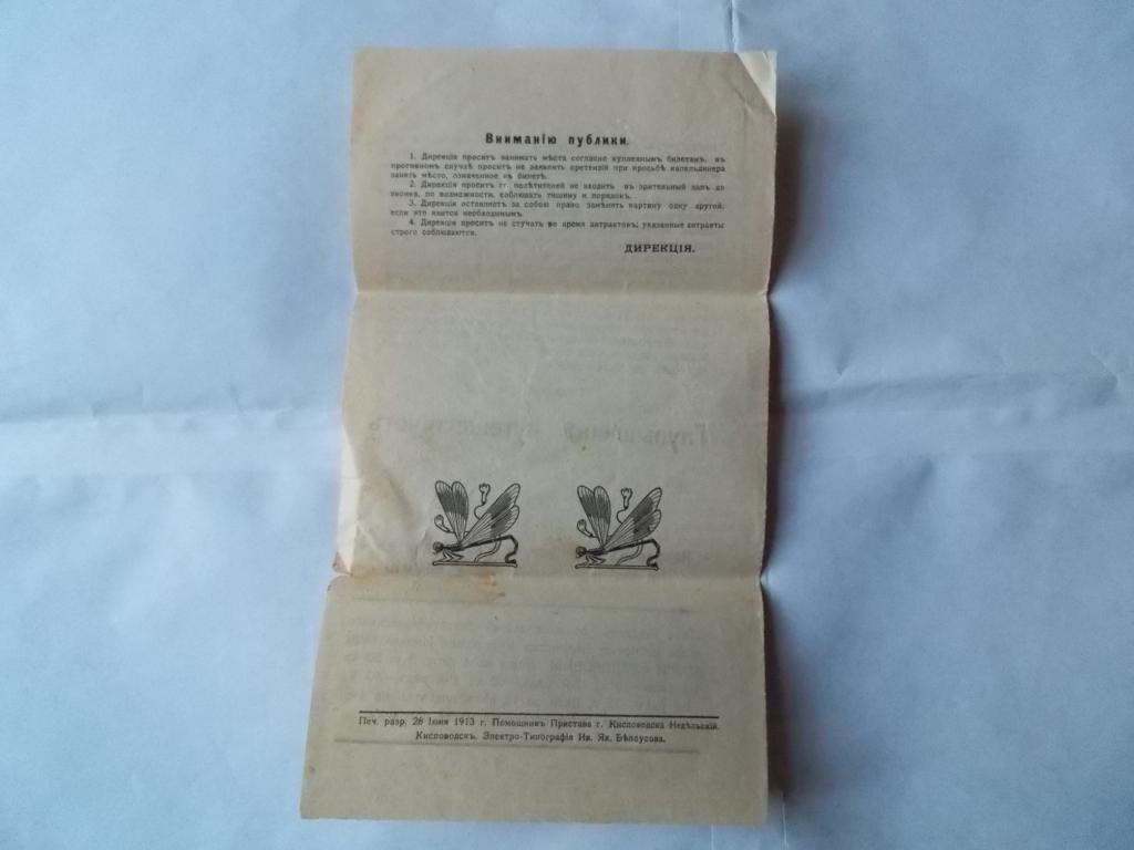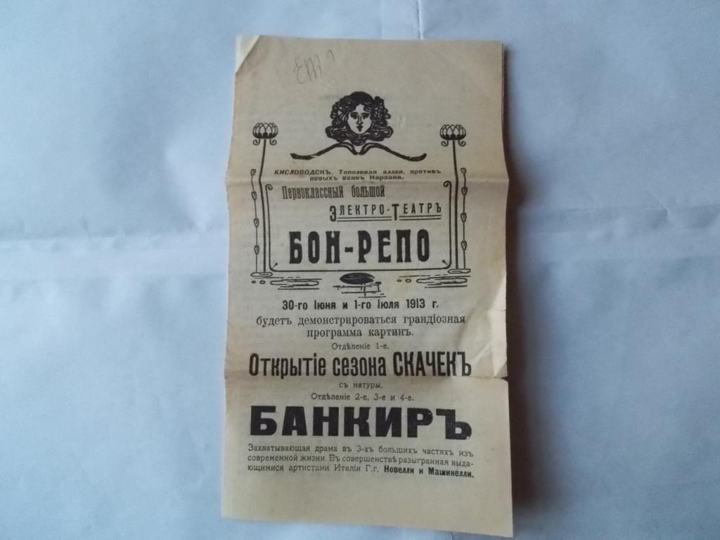 Старинная программа синематографа.1913 год.Кисловодскъ.Оригинал.Бумага.Размеры программы(см. фото 1):25 см.на 13,8 см..Незначительные повреждения.Оплата лота почтовым переводом или банковским переводом КОНТАКТ,карта с.б..