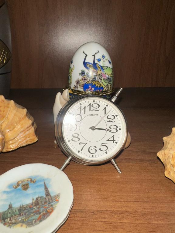С белым цифирблатом Ракета, сделано в СССР. Один бубен отвалился (есть в наличии). Тоже только будильник звучит, а стрелки не работают.