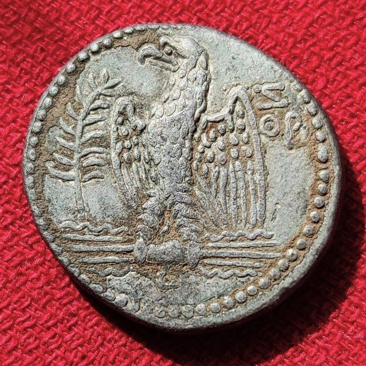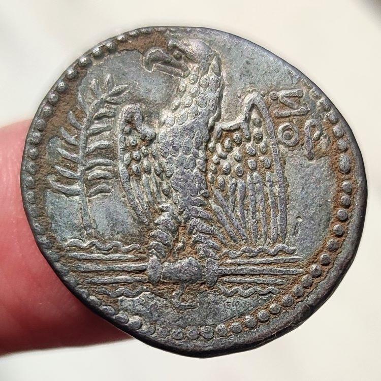 Предлагаю красивую тетрадрахму императора Нерона с орлом, отчеканенную на монетном дворе Антиохии в 60-61 годах. Легенда на тетрадрахме отчеканена на греческом языке, так как эта монета была отчеканена для хождения в восточных провинциях Империи с преимущественно греческим населением. Она гласит: Obv: SEBASTOS NERWN KAISAR Rev: орел сидит на пучке молний Зевса, справа литеры ретроградная Z и ΘΡ говорят о том, что эта монета была отчеканена в 109 году Caesarean Era (60-61 годы). Вес тетрадрахмы 14,78 гр. Диаметр монеты 26 мм. Ссылка McAlee 257; Prieur 81; RPC I 4181. Монета сфотографирована с большим увеличением.