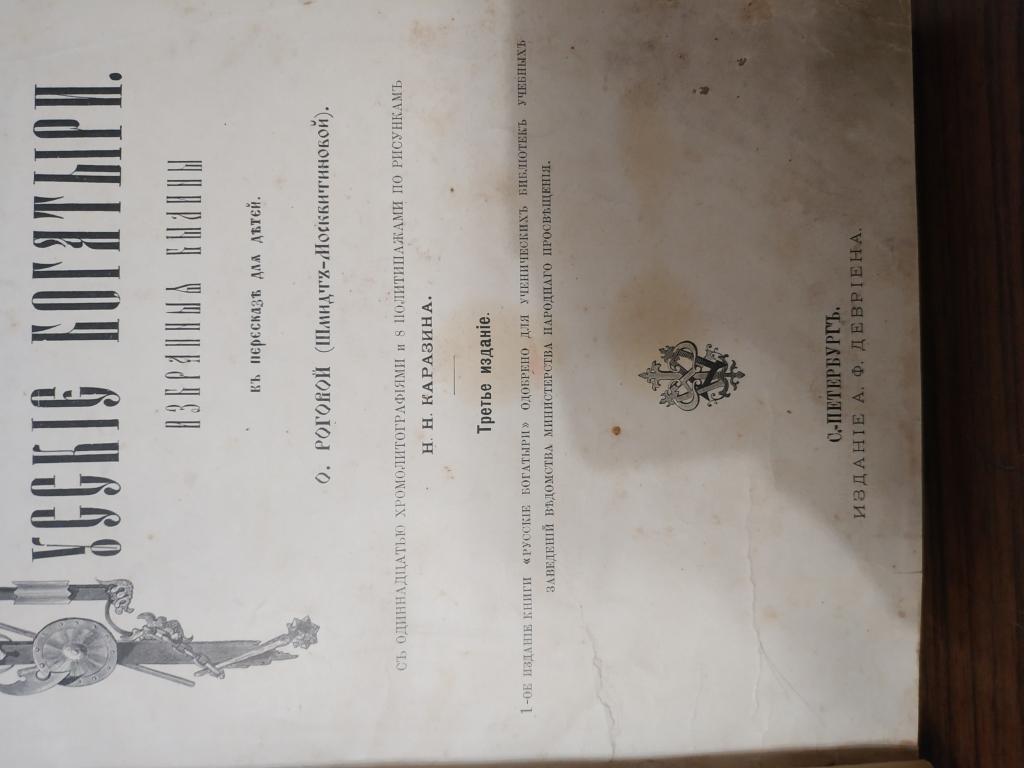 Русские богатыри избранные былины. О. Роговой ( Шмидт-Москвитиновой). С 11 хромолитографиями и 8 политипажами по рисункам Н.Н.Казарина. Издание 3. Издание А.Ф.Девриена. Типография товарищества 'Общественная Польза'. Состояние отличное. Фото.