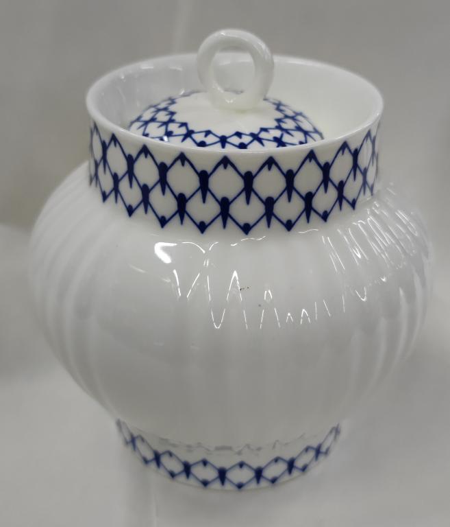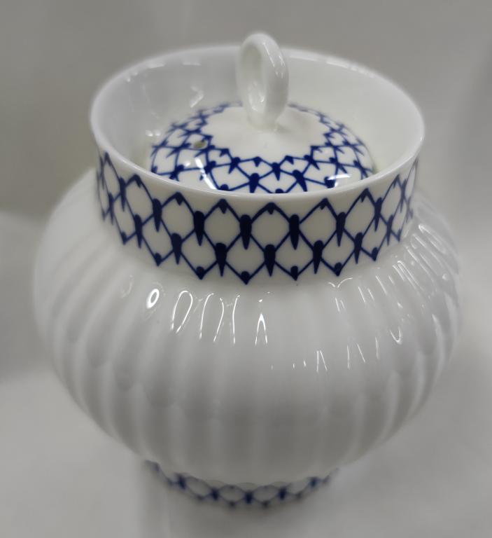 Сахарница ЛФЗ. (223803). Диаметр верх 6,9 см, низ 6,5 см. Высота 12 см. Крышка диаметр 3,5; 5 см. Состояние хорошее. Фото.