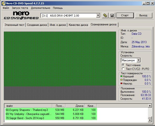 царапины; ошибок чтения нет (проверен программой Nero CD-DVD Speed