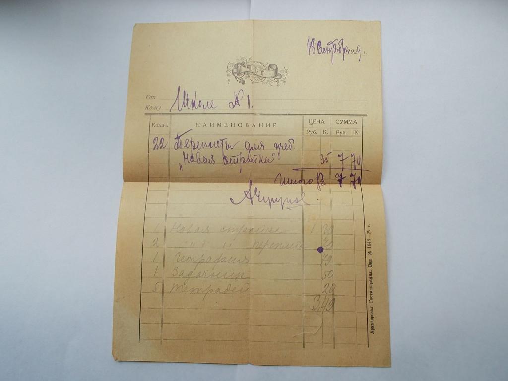 Счёт школе №1.1929 год.Оригинал.Бумага.Имеется повреждение.Оплата лота на карту Сбербанка,почтовым переводом.