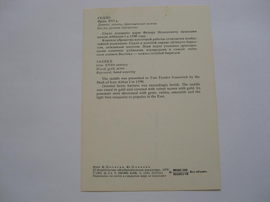 Купите "Седло. Оружейная палата. 1978" по цене 20a.Покупайте сейчас, чтобы не упустить эту отличную цену на “Auction.ru” или сделайте свое предложение продавцу.