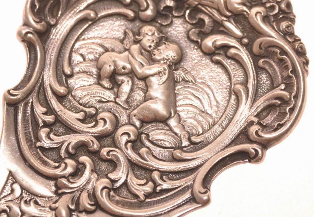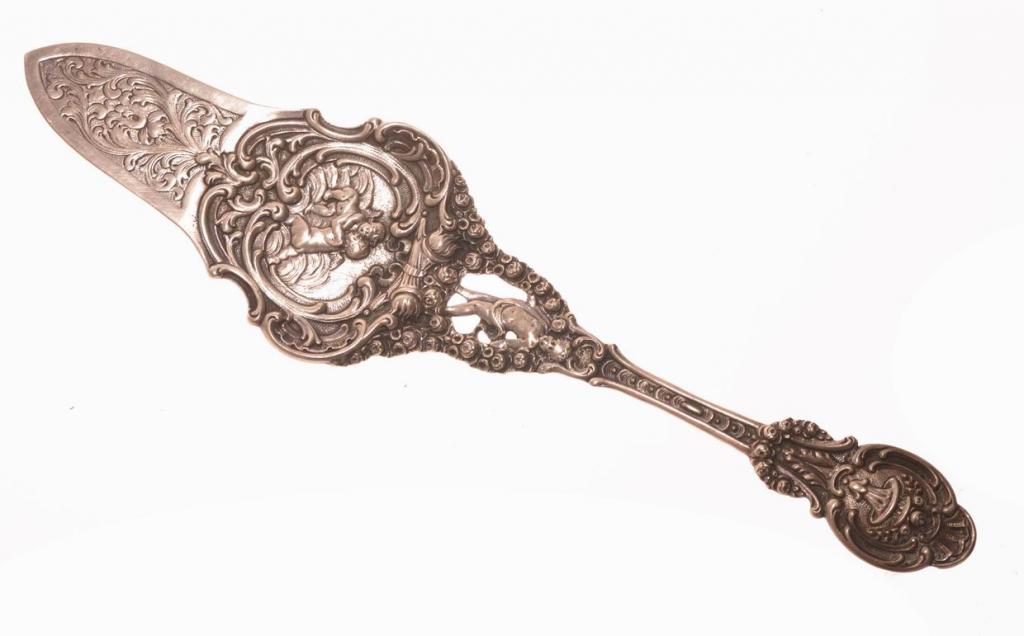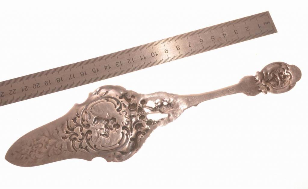 Германия. Начало прошлого века. Хорошее коллекционное состояние. Цельно литая из серебра 800 пробы. Богато украшена: рельефный растительный орнамент, амуры, два скрещенных факела. Такая лопатка будет украшением праздничного стола, всегда может стать хорошим запоминающимся подарком...Вес 56.8 гр.Длинна 24.5 см.Ширина 6.5 см.Здравствуйте, спасибо за внимание к моему лоту.🙂 Все вопросы по доставке, оплате задавайте мне до покупки. Я выставляю здесь лоты по фиксированной цене. Небольшой торг возможен на ряд позиций — предлагайте свои варианты в разумных рамках. Дополнительные фото выставленных вещей я с радостью предоставлю по Вашему запросы, но на все всегда требуется время (и память). Оплата многих лотов возможна в Москве наличными, но часть продаю только по оплате на карту Сбербанка. И оплату надо произвести до 2 дней после ставки. Лоты отправлю в любой город страны через почту России или СДЕК. ( Но Сдек не все вещи принимает к отправке) Стоимость почтовых расходов по тарифам почты России оплачивает покупатель. Высылаю в течении 2-3 рабочих дней после получения 100% оплаты лота и почтовых расходов (бывает и раньше, но это от наличии времени и других заказов). Если вы с Москвы, то может быть выйдет передать предмет сразу в этот же день. ВСЕ УТОЧНЯЙТЕ В ЛИЧКЕ! После отправления предоставляю скан почтового чека с номером посылки, для дальнейшего отслеживания ее. 🙂 Гарантирую надежную упаковку. Самовывоз из юго-западного района Москвы по договоренности. И еще, наличие понравившейся вещи, лучше всегда уточнять перед ставкой ! Редко, редко но бывает, что не успеваю снести лот 🙄…