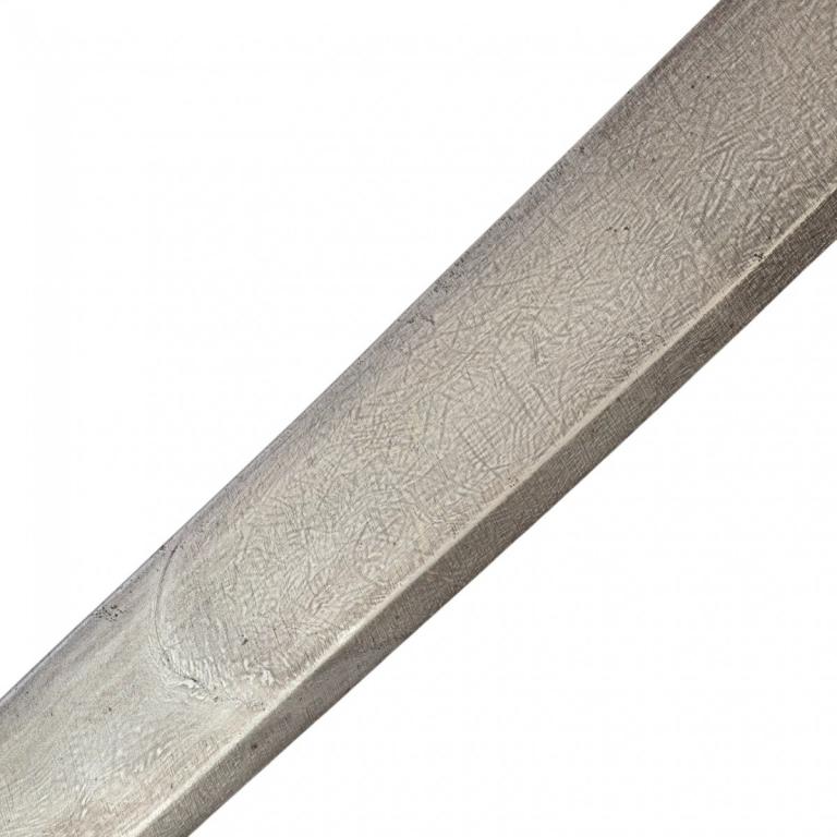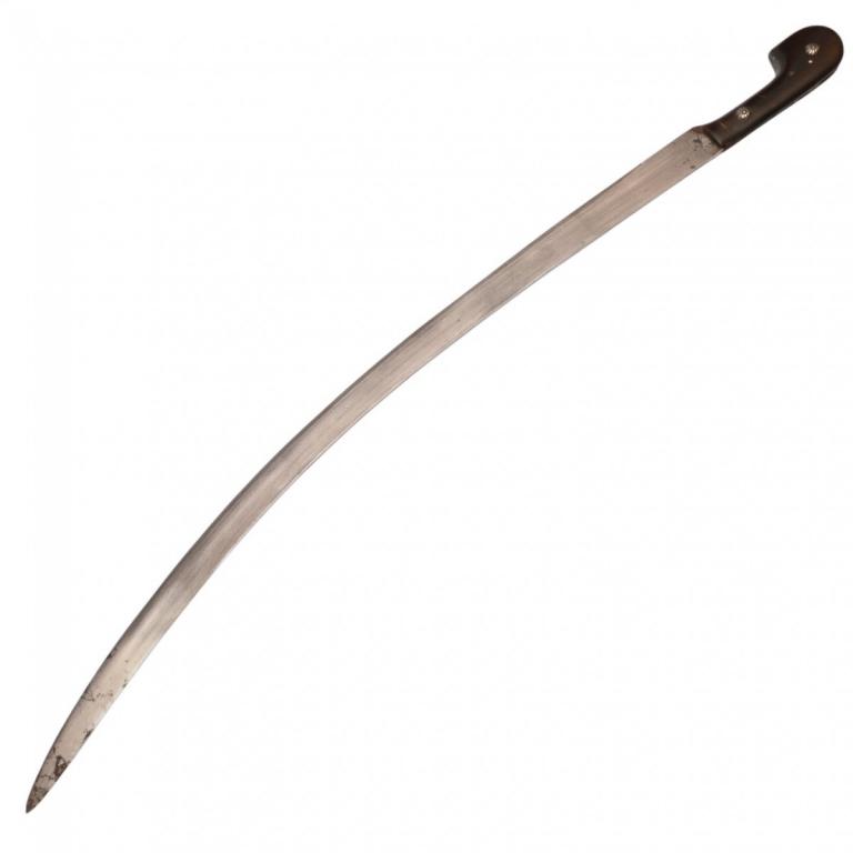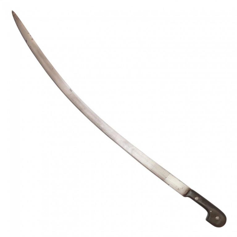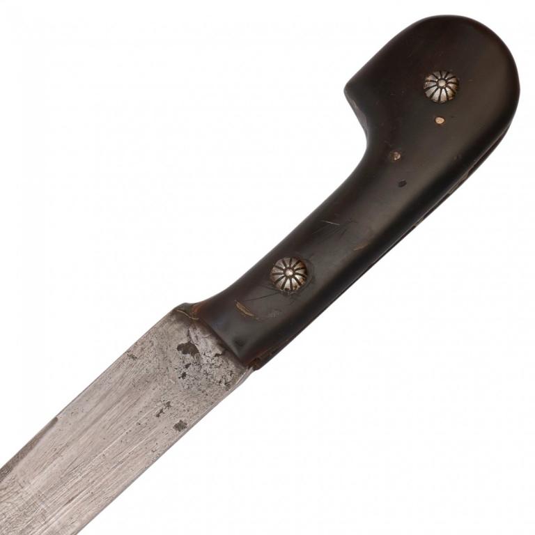 Оригинальная шашка в хорошем коллекционном состоянии. Клинок изготовлен из дамасской стали (?), незначительно изогнутый, однолезвийный, плоский, без долов, боевой конец двулезвийный. Эфес состоит только из рукояти с раздвоенной головкой. Рукоять изготовлена из рога и крепится к черенку клинка при помощи двух заклёпок, которые закрывают декоративные накладки. Ножны отсутствуют.