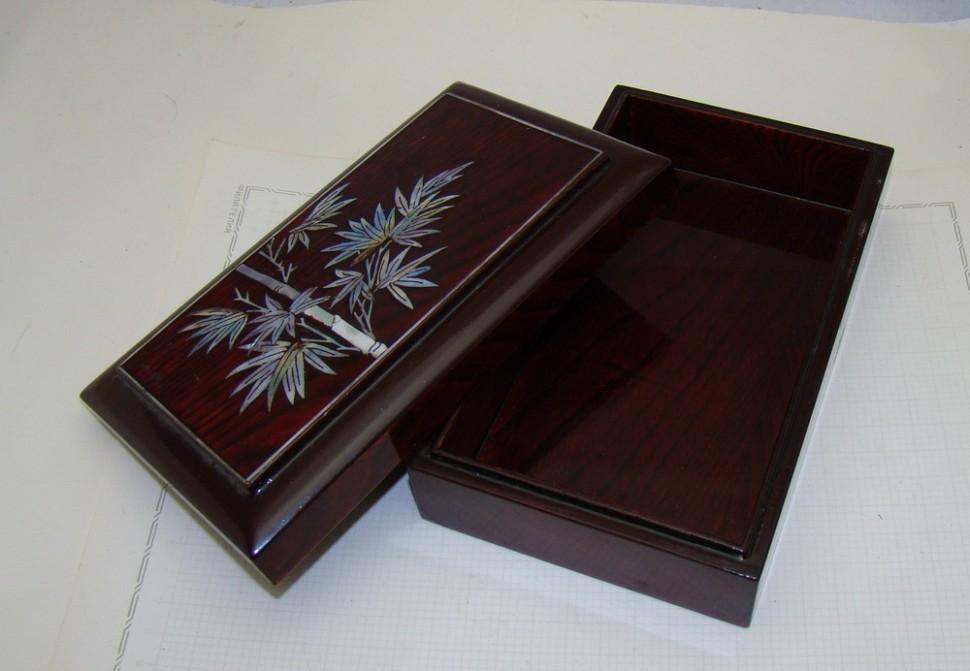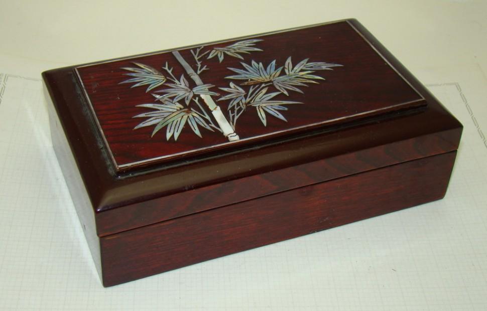 Дерево, инкрустация перламутром. Размер: 17,5х10,5х5,5 см.