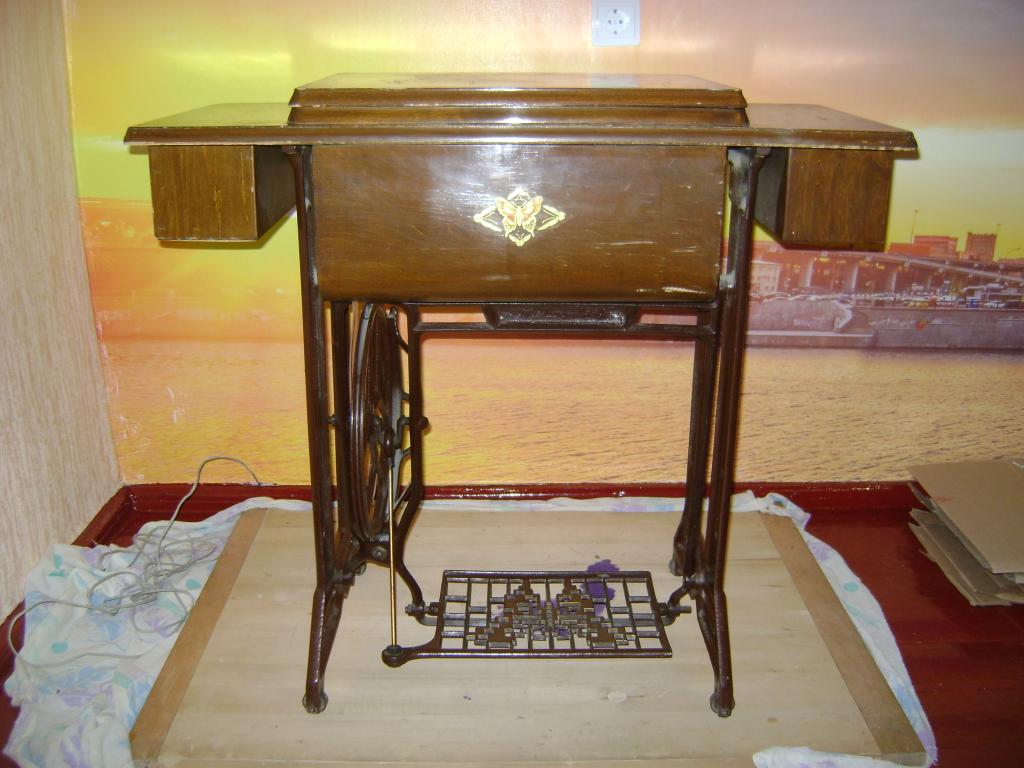 Винтажная ножная швейная машинка Butterfly с выдвижными ящиками по бокам столешницы.