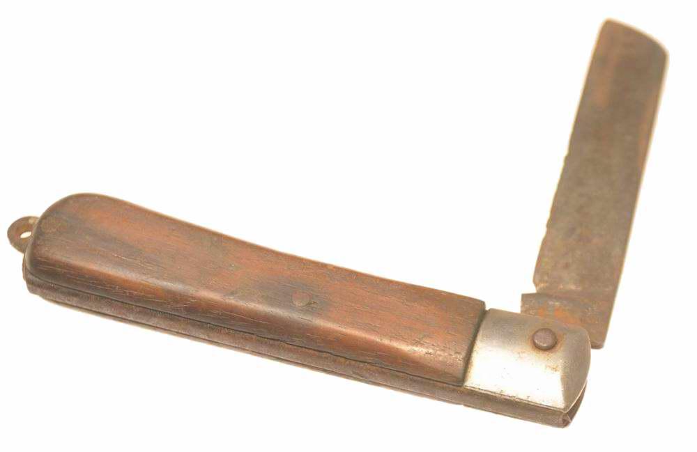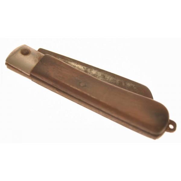 Складной ножик. Возможно это нож электромонтера или морской (боцмана). Качественное и практичное изделие середины XX века.Клинок из закаленной стали, до сих пор хранит остроту, достойную самурайского меча. Да и по форме напоминает оный, с чуть изогнутым силуэтом, готовым рассечь воздух с грацией и мощью. У у основания лезвия стоит штамп.Рукоять, выполненная из прочной, устойчивой к воде древесины, удобно ложится в руку, Маркировка на лезвии.Этот винтажный нож станет отличным дополнением к коллекции антиквариата, ценным подарком для любителя военной истории или артефактом для ценителя японской культуры.Клинок у ножа выполнен наподобие Танто.Танто – это ножевой клинок с узнаваемым угловатым профилем, название которого восходит к японскому короткому мечу. Его отличительной чертой является наличие двух режущих участков: основного и вспомогательного, соединённых выраженным переходом, формирующим как бы две плоскости для реза. Исторически танто служил средством личной защиты, но сегодня он представлен в различных вариантах, включая тактические и складные модели.Специфика лезвия танто:Угловатая геометрия: Отличается от обычных лезвий выраженным углом соединения основного и короткого лезвий, создавая эффект двух режущих поверхностей, расположенных под разными углами.Историческое значение: Первоначально был коротким клинком самураев, предназначенным для ближнего боя или самозащиты, а также применялся в ритуальных целях, например, при сэппуку.Применение в наши дни: Хотя современный танто не относится к холодному оружию в РФ, он востребован среди специалистов по спасению и ценителей тактических ножей благодаря его надёжности и многофункциональности.Материалы и методы изготовления: Современные танто могут изготавливаться из разных сортов стали и иметь разнообразную конструкцию. Классические японские танто, напротив, производятся по специализированным технологиям из особого железа, и их создание подлежит лицензированию.Длина в разложенном состоянии 20 см.В сложенном виде 11.7 см.Длинна клинка 8.5 смЗдравствуйте, спасибо за внимание к моему лоту.🙂 Все вопросы по доставке, оплате задавайте мне до покупки. Я выставляю здесь лоты по фиксированной цене. Небольшой торг возможен на ряд позиций — предлагайте свои варианты в разумных рамках. Дополнительные фото выставленных вещей я с радостью предоставлю по Вашему запросы, но на все всегда требуется время (и память). Оплата многих лотов возможна в Москве наличными, но часть продаю только по оплате на карту Сбербанка. И оплату надо произвести до 2 дней после ставки. Лоты отправлю в любой город страны через почту России или СДЕК. ( Но Сдек не все вещи принимает к отправке) Стоимость почтовых расходов по тарифам почты России оплачивает покупатель. Высылаю в течении 2-3 рабочих дней после получения 100% оплаты лота и почтовых расходов (бывает и раньше, но это от наличии времени и других заказов). Если вы с Москвы, то может быть выйдет передать предмет сразу в этот же день. ВСЕ УТОЧНЯЙТЕ В ЛИЧКЕ! После отправления предоставляю скан почтового чека с номером посылки, для дальнейшего отслеживания ее. 🙂 Гарантирую надежную упаковку. Самовывоз из юго-западного района Москвы по договоренности. И еще, наличие понравившейся вещи, лучше всегда уточнять перед ставкой ! Редко, редко но бывает, что не у