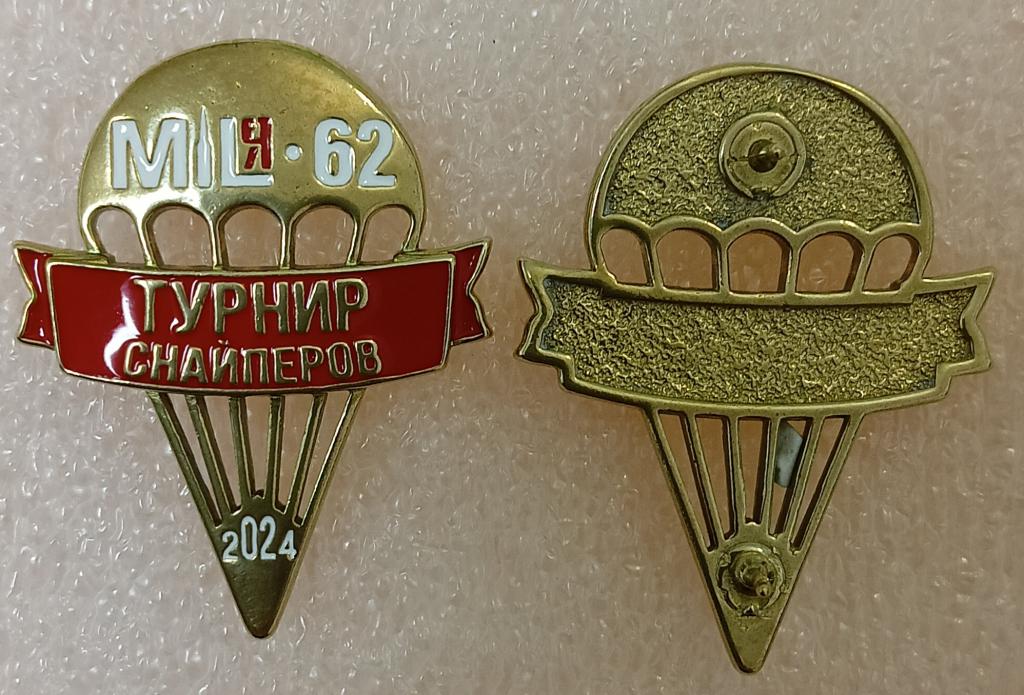 Знак для участников и судей соревнований по спортивному снайпингу "Миля-62", посвященных памяти снайперов 137-го гвардейского ПДП, погибших при исполнении боевых задач в ходе СВО: Лукина Павла Александровича, Сизых Егора Андреевича, Егорова Виталия Евгеньевича. Соревноаания были организованы Центром спортивного снайпинга (ЦСС) совместно с Командованием ВДВ ВС РФ.