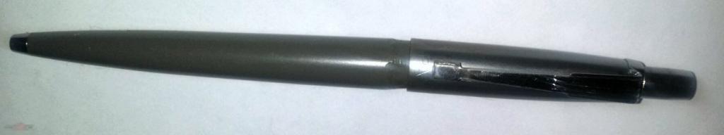 старенькая шариковая ручка Pax. серый пластик, металл. длина 12.5см. обломан и обгрызан пластик с резьбой и около. заедает кнопочный механизм