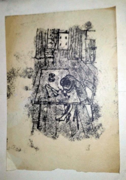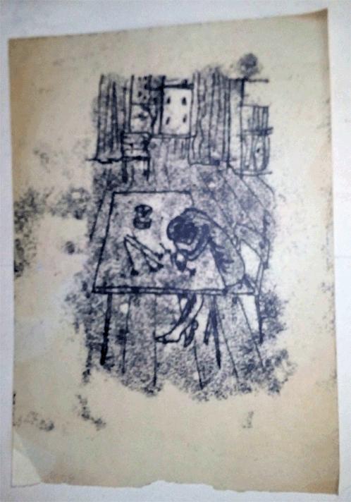 старенький эстамп Спящая за столом. бумага. размер: 28х20 см. состояние на фото
