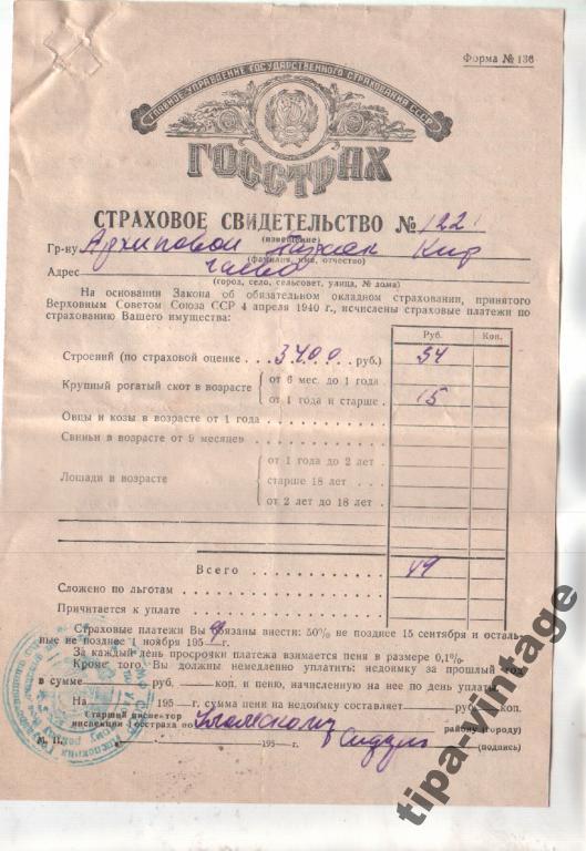 Страховое свидетельство 1959 год
