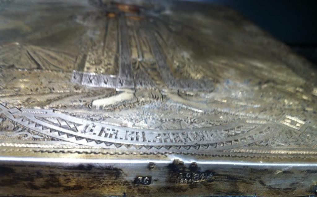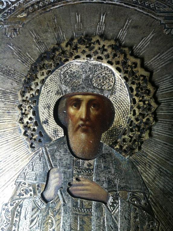 Одна из самых редкио встречаемых именных икон с изображением Святого Великого Князя Владимира написана на доске маслом в богато украшенном гравировкой и золочением окладе из серебра 84 пробы 1884 года.