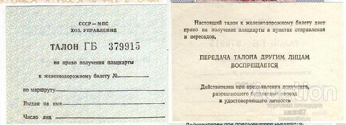 МПС СССР Хозяйсивенное управление. Талон на право получения плацкарты.