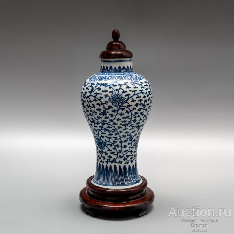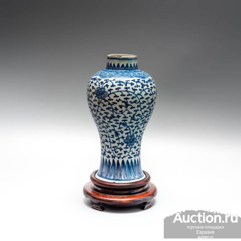 Ваза украшена прекрасной ручной росписью подглазурным кобальтом. Основной декор — круговая композиция из побегов лотоса с вьющимися стеблями и стилизованными цветами.