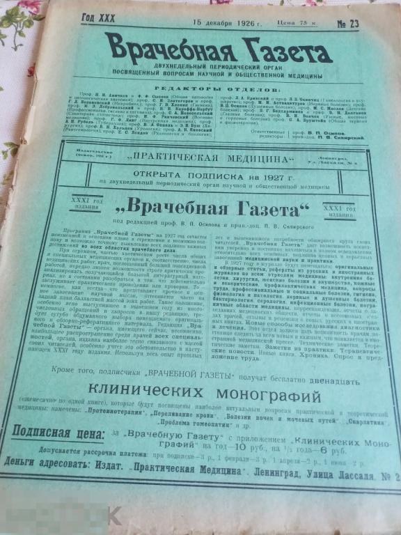 Врачебная газета. 15 декабря 1926г. Номер 23. Типография Торговой