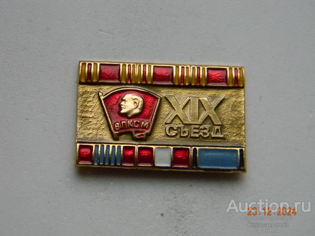 Значок XIX съезд ВЛКСМ, выпуск СССР, легкий металл, заколка, клеймо ШМ. Состояние на скане