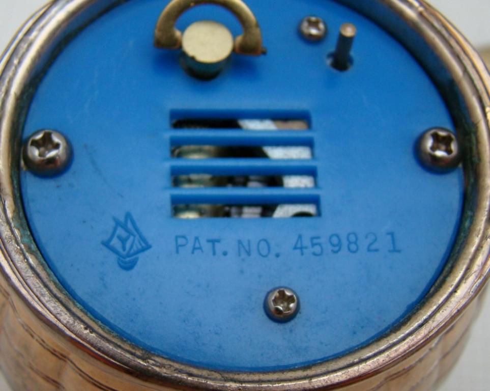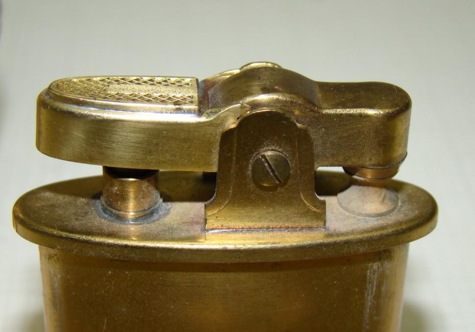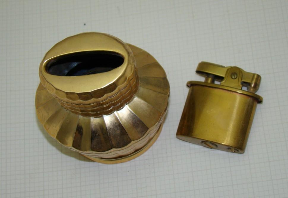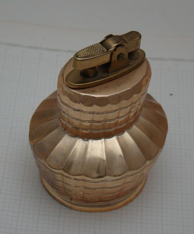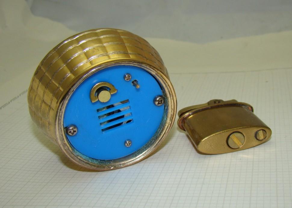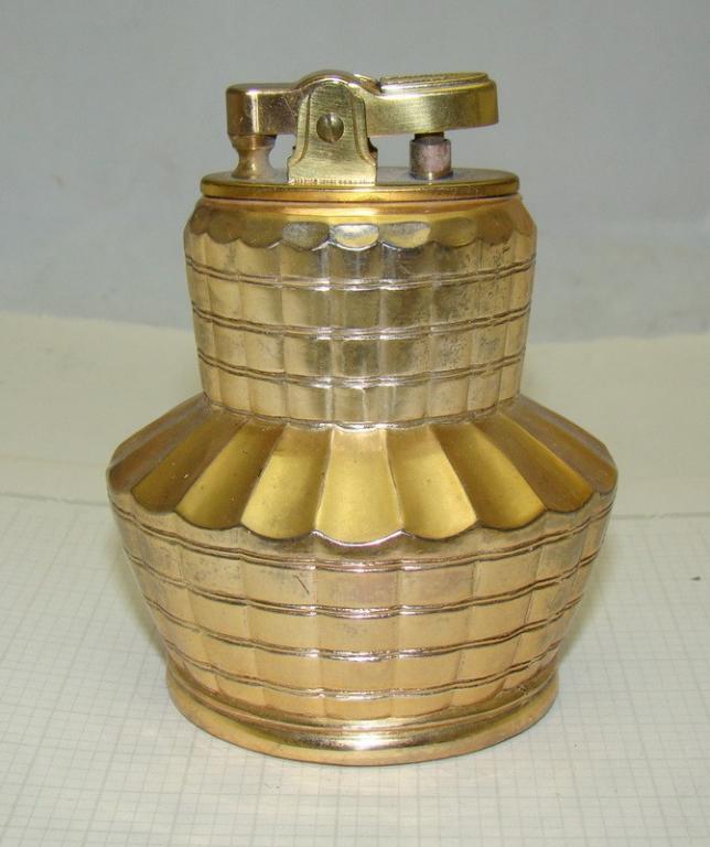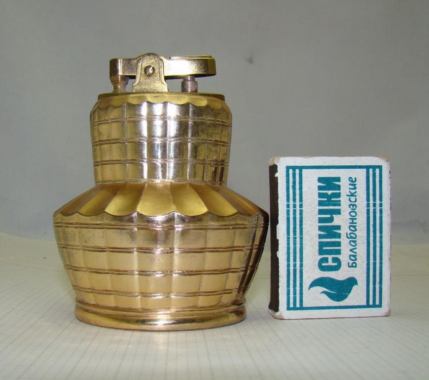 Золочение. Высота 8,5 см. Патентованный, заводной музыкальный механизм. Мелодия начинает играть при поднятии зажигалки со стола. Послушать мелодию.