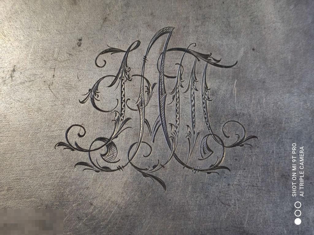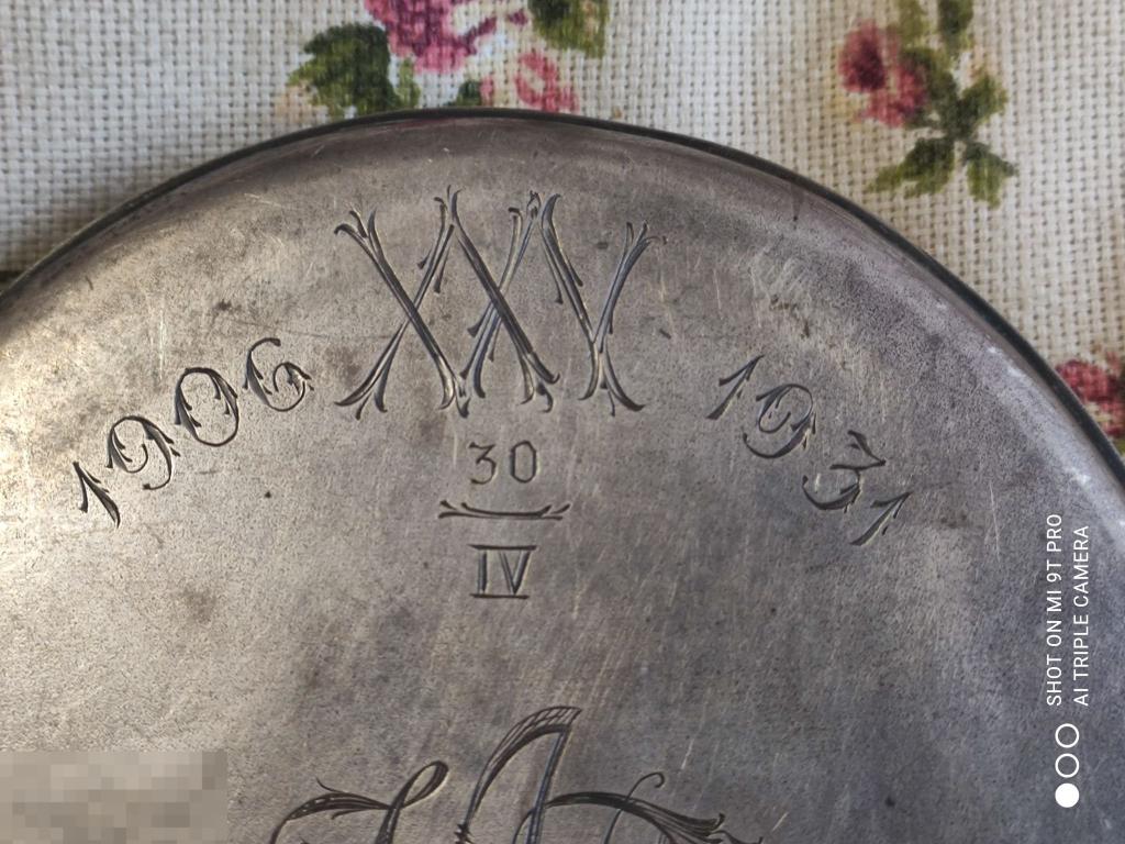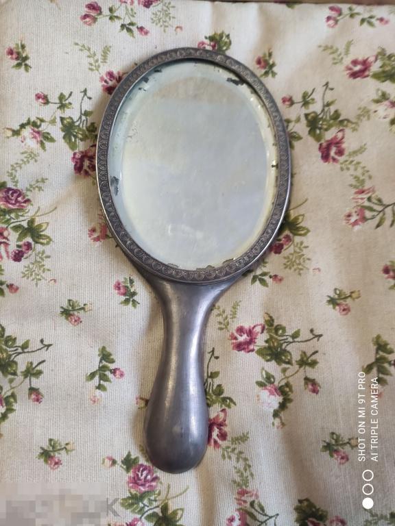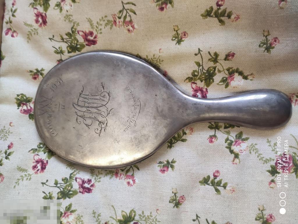 Зеркало старинное. Серебро. Без пробы. С дарственной надписью и монограммой. Длина с ручкой 25,5 см. Овал 15 х 11,8 см. Состояние на фото.