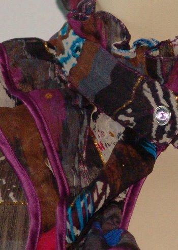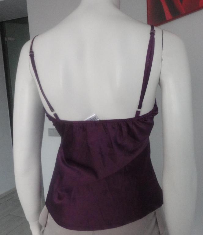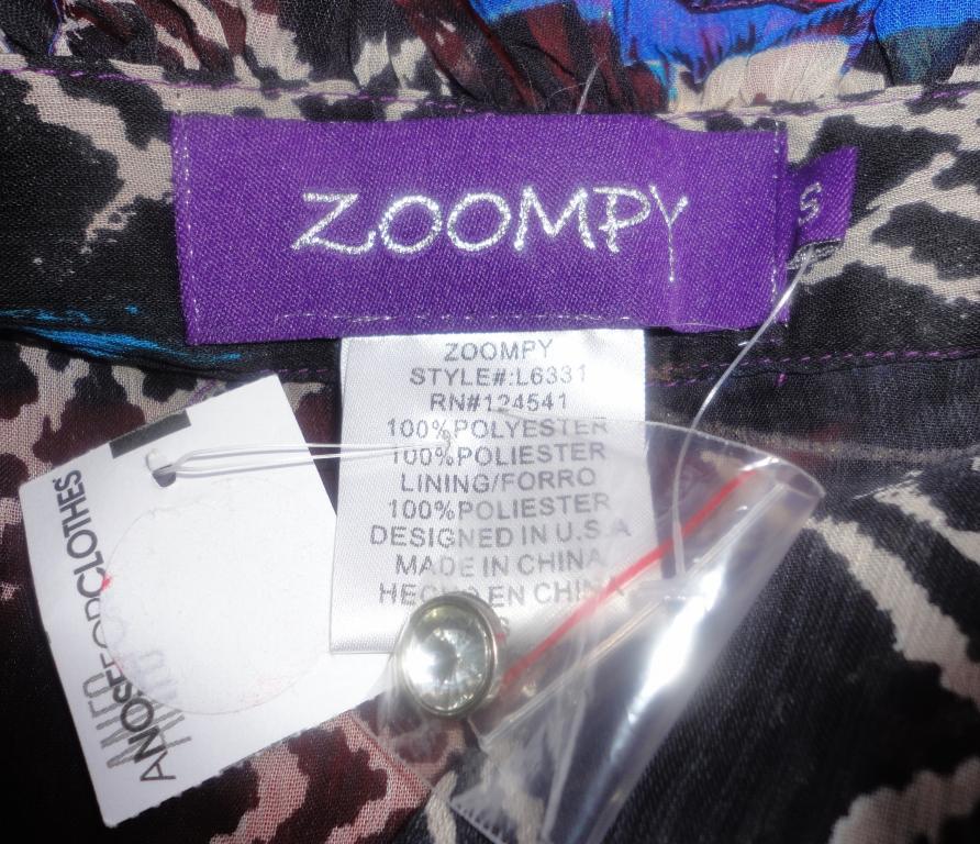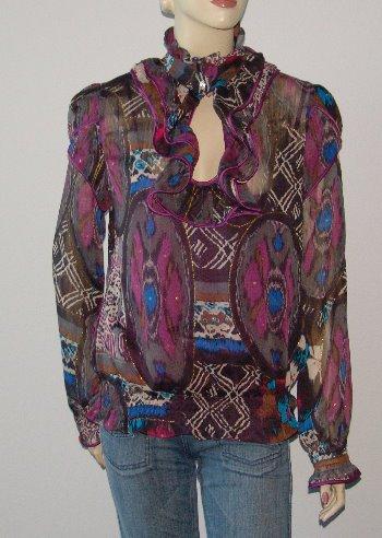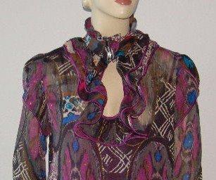************************************************************************************************* американская марка одежды ZOOMPY из Лос-Анджелеса Яркая блузочка,женственный фасон.Искусственный шифон,рюши на вороте,воротник-стойка застегивается на очень красивую пуговицу-стразину,Низ присобран на резинку-вафельку,так же присобран и манжет.Ткань блузы полупрозрачная,но в комплекте есть атласный фиолетовый топ.