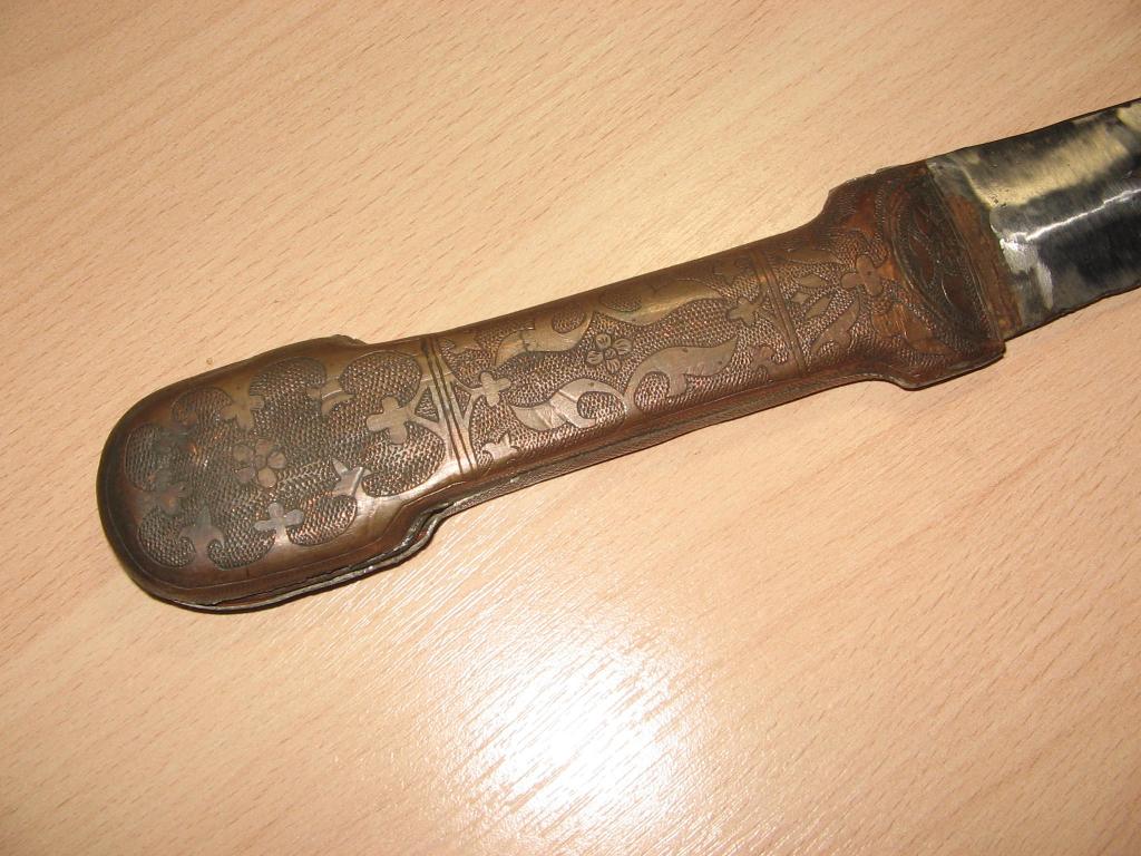 Кривой солдатский кинжал обр. 1907 г. с латунной неуставной рукояткой, украшенной орнаментом. Состояние на фото. Рукоятка плохо закреплена.